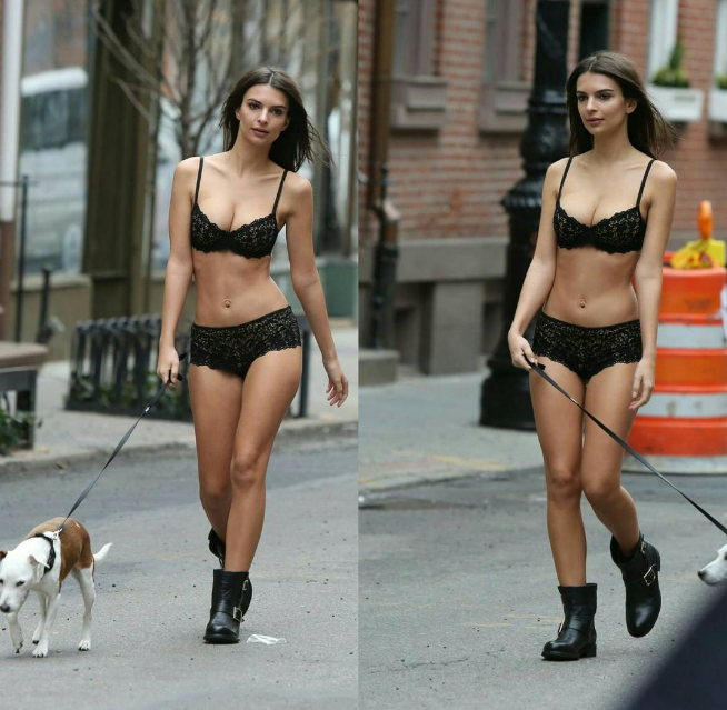 Resulta que la también actriz decidió posar para la lente en calles de Nueva York, mientras paseaba a su perro y luciendo un sexy conjunto de lencería negra de encaje con la que presumió sus atributos.