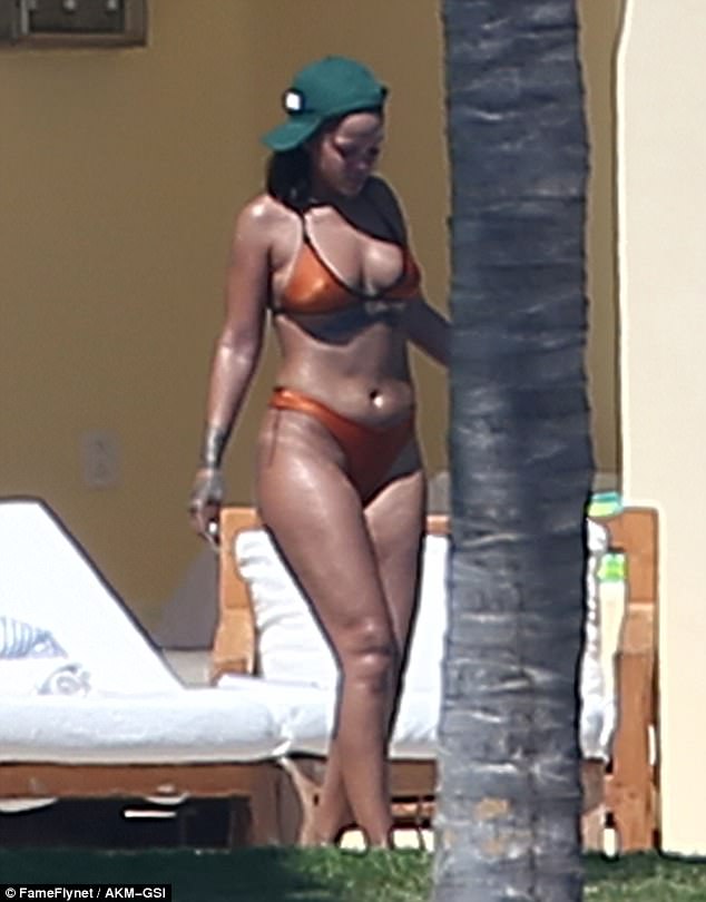 La cantante, de 29 años, se dejó ver en la piscina de un hotel luciendo un diminuto bikini color naranja, con el que lució sus espectaculares curvas y tatuajes. Tras colocarse bronceador en todo el cuerpo, se recostó en un camastro donde platicó varios minutos con una de sus acompañantes.