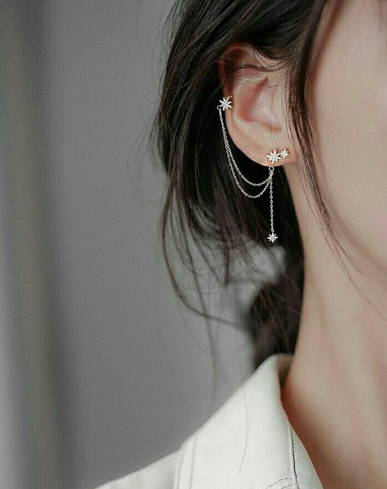 Los aretes de cascada o de cadenita son aquellos que cuentan con dos agujas, una en cada extremo para colocarse a largo o ancho de la oreja. Puedes colocarlos en la parte superior de tu oreja a lo ancho, u optar por diseños verticales. ¿No tienes las orejas perforadas o sólo tienes una perforación? No te preocupes, existen diseños modificados para que cualquier persona los pueda lucir. Están aquellos que sólo cuentan con una aguja y un clip en el otro extremo para poder sujetarse, así como el que te compartimos en la imagen.