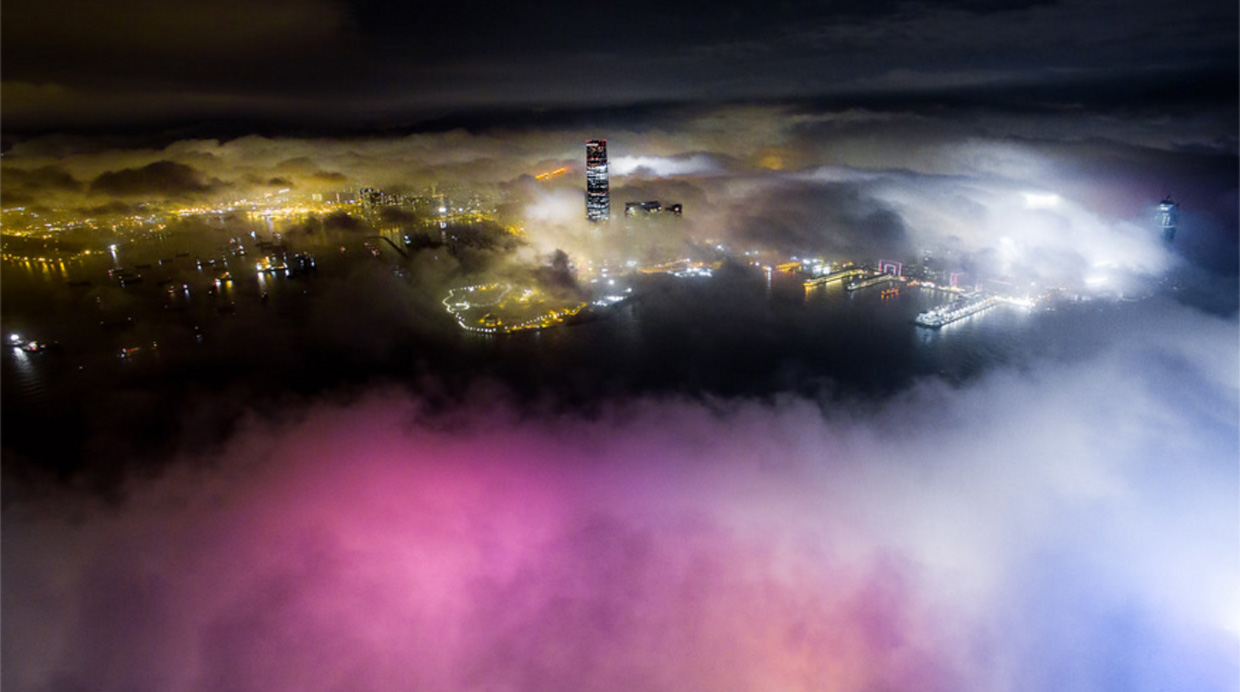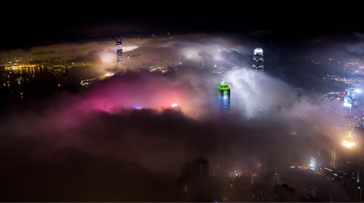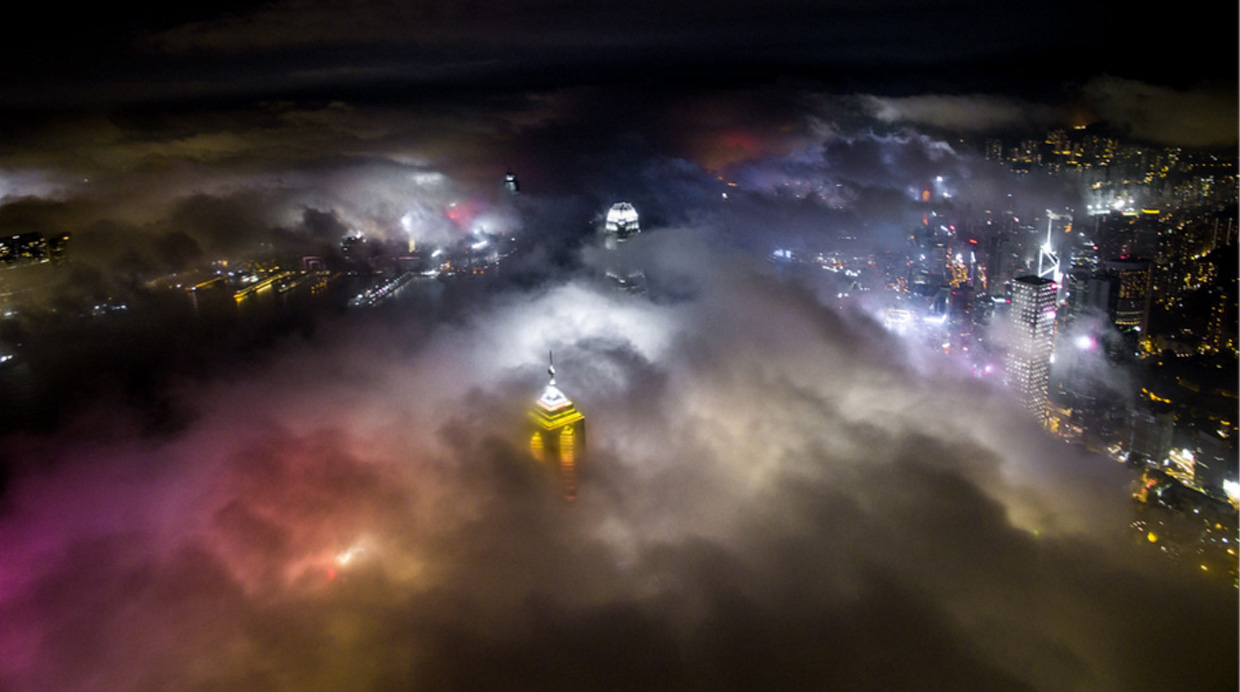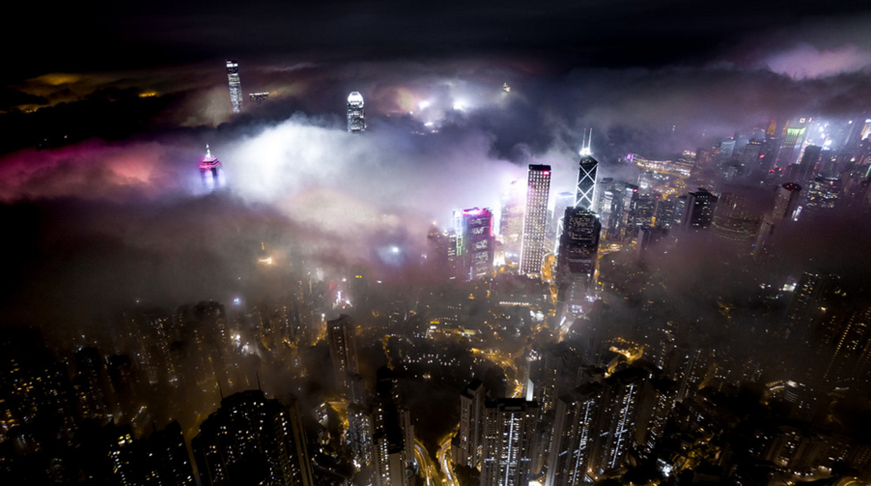 Se trata de Hong Kong y luce así, debido a que durante la primavera la ciudad se llena de neblina, que al combinarse con las luces de los impresionantes rascacielos de este lugar, nos regala un maravilloso show que combina la arquitectura con la naturaleza, el cual fue fotografiado por Andy Yeung con ayuda de un dron.