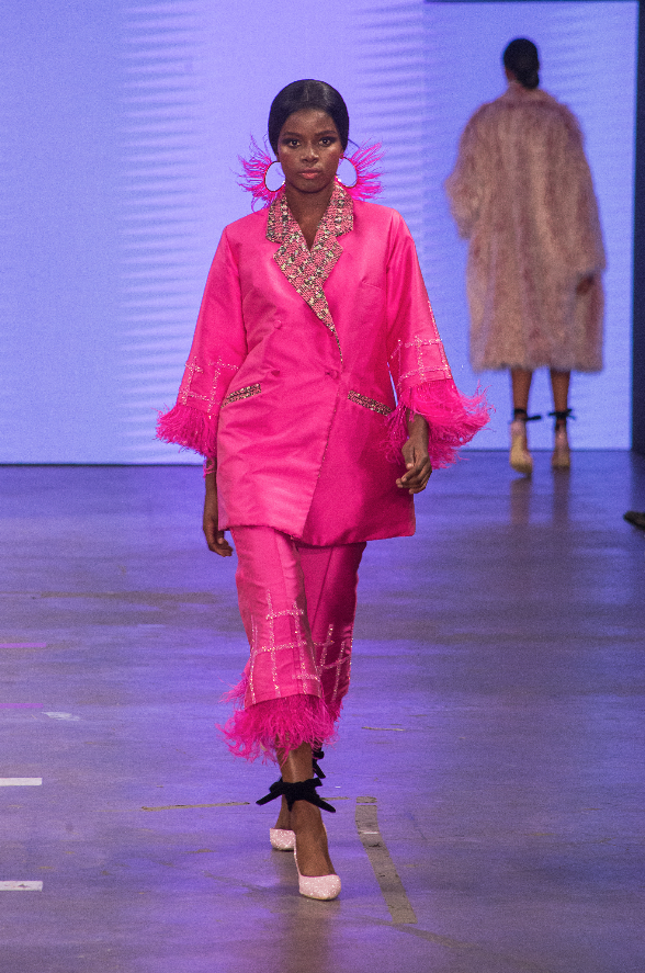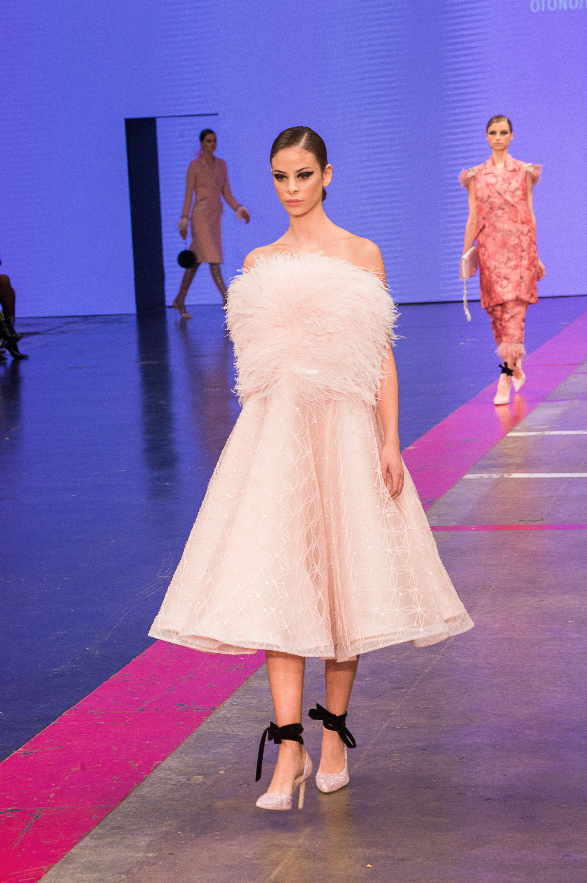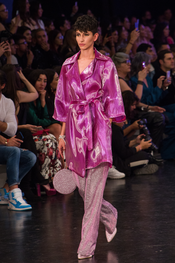 Las luces se apagaron, un violinista apareció en la pasarela y con música en vivo comenzó la magia. Desde el primer atuendo, Benito Santos prometía una colección inolvidable. El rosa fue el protagonista, y para complementar la paleta de colores, el creativo agregó diseños en tonos morado, plateado y sutiles detalles negros.