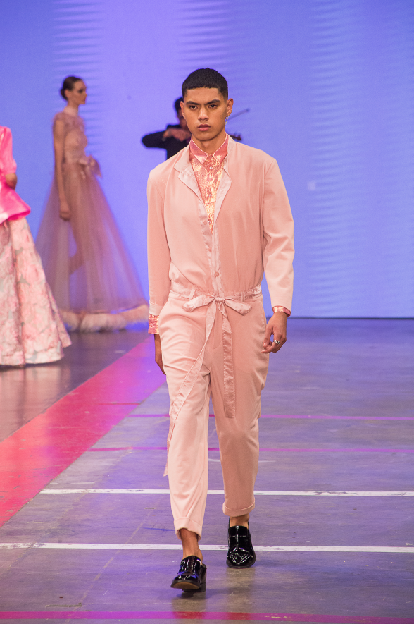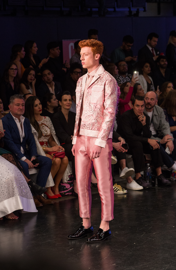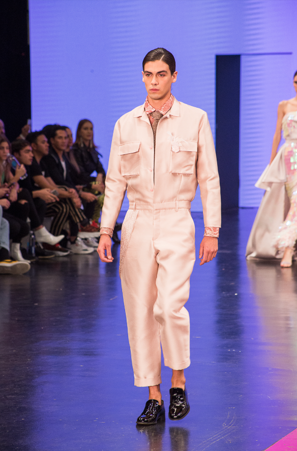 La apuesta más grande de Benito Santos fue el conjunto de diseños para hombre, que bajo la misma línea de elegancia presentó el lado más masculino del rosa.