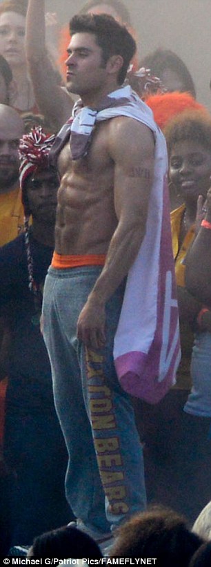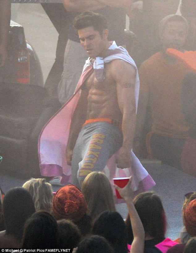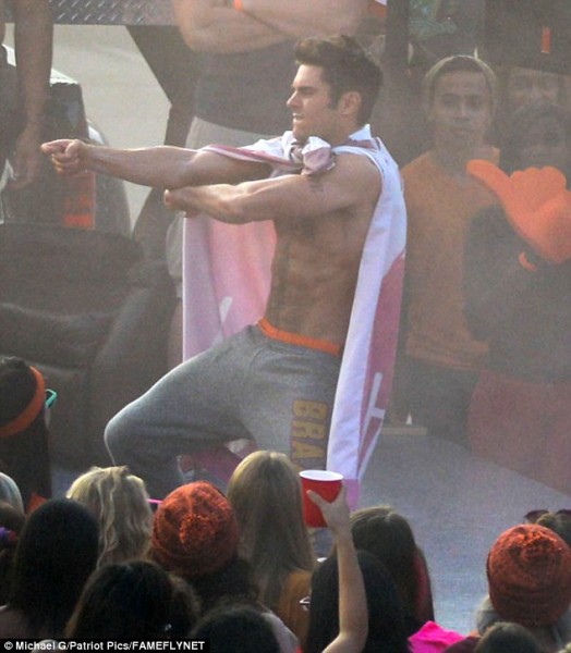 Al inicio del sexy baile, Efron comienza con una capa que en realidad es una toalla rosa sujetada de su cuello y un pants deportivo gris con contrastes anaranjados para después terminar sólo en boxers ajustados.