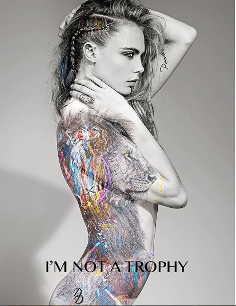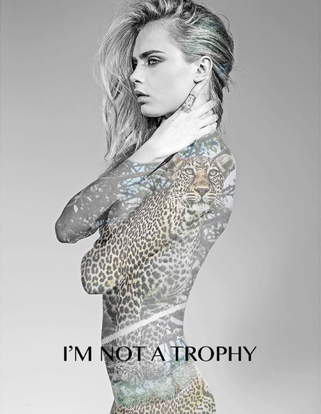 La modelo Cara Delevingne sorprendió al posar desnuda para la primer campaña internacional de ‘I’m not a trophy’ (No soy un trofeo) que busca impulsar a la gente a tener una mejor educación y entendimiento de las consecuencias de la caza de animales y pensarla como trofeo.