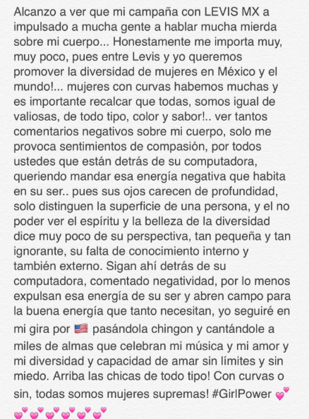 Ante esto, la interprete no se quedó callada y a través de sus redes sociales escribió: “Para todos mis fieles haters! Les mando mucho amor y compasión a su ser lleno de odio, deseo que encuentren amor en su interior algún día”. Esto, acompañado de una imagen en la que aparece el siguiente mensaje: “Ver tantos comentarios negativos sombre mi cuerpo, solo me provoca sentimientos de compasión, por todos ustedes… Sus ojos carecen de profundidad, solo distinguen la superficie de una persona, y el no poder ver el espíritu y la belleza de la diversidad dice poco de su perspectiva”. Te presentamos el mensaje que completo.