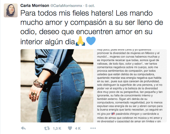Cabe mencionar que esta campaña de ropa vio la luz en septiembre pasado y está inspirada en mujeres con cuerpos curvilíneos, situación por la que Morrison no pudo evitar mostrar su enojo ante las críticas. Lo que es un hecho, es que aplaudimos el mensaje que la interprete de temas como: Eres tú, Déjenme llorar, Pan Dulce y Lágrimas, envió a todos los usuarios de redes sociales. ¡Bien por ella!
