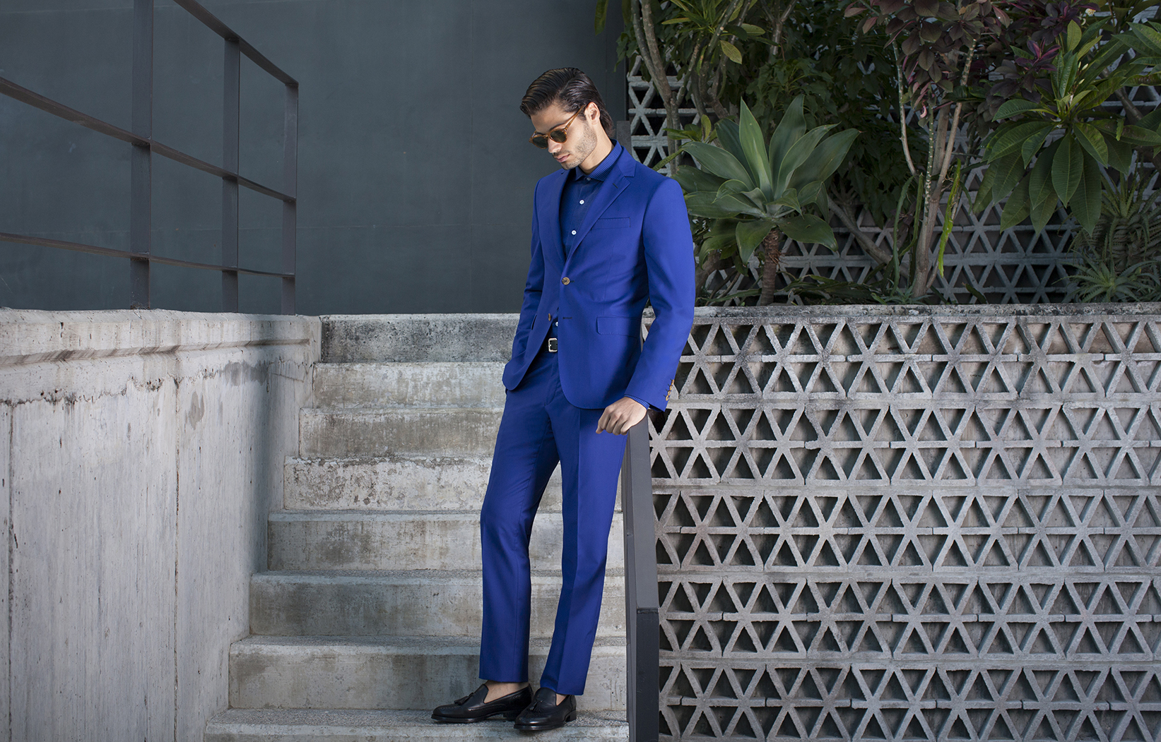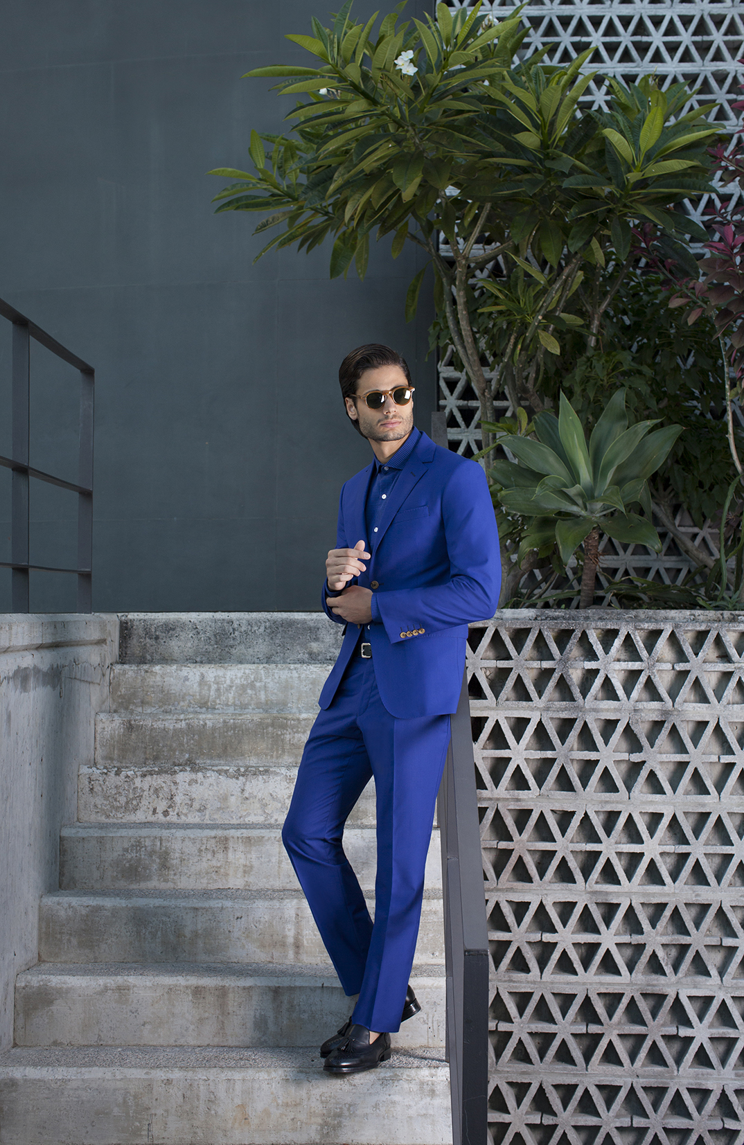 La elección del color azul cobalto, representa el espíritu de toda la colección: atrevido, joven, inesperado, seguro de si mismo y frescura. Con una construcción ligera, este traje se puede utilizar como un separate, siendo así todo el conjunto como estelar o por separado y mezclado con elementos como t-shirts o pantalones de mezclilla.