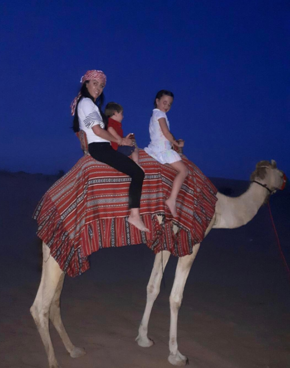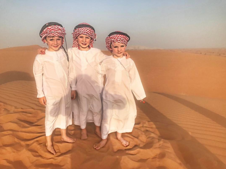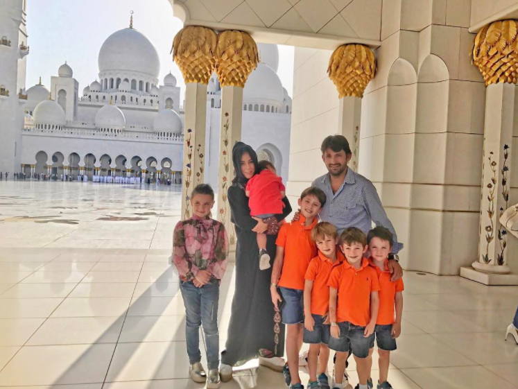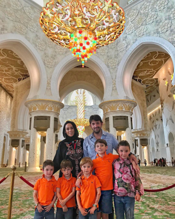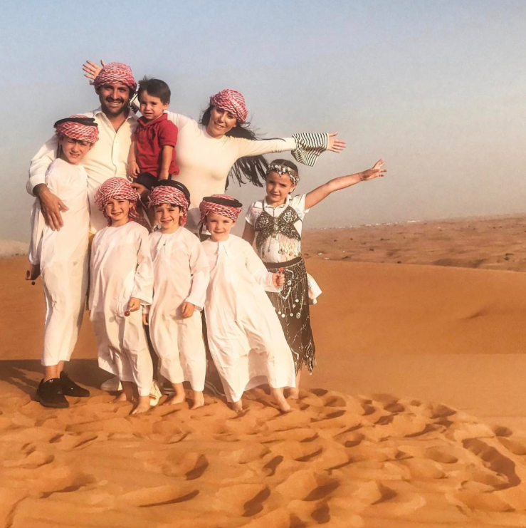 Inés Gómez Mont y su esposo Manuel Álvarez Puga, llevaron a sus seis pequeños a un viaje inolvidable por Dubai y demás lugares de Medio Oriente. Como es costumbre, la conductora vistió a todos sus pequeños de la misma manera solo que en esta ocasión los disfrazó con túnicas árabes blancas y un turbante rojo. Mientras Inesita vestía un traje típico de danza árabe.