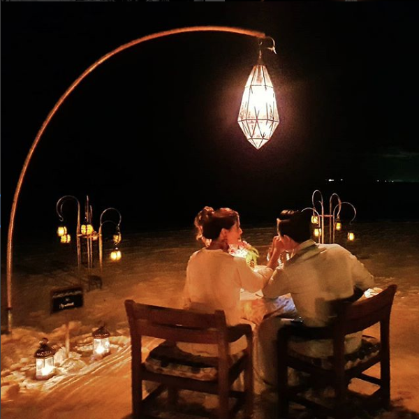 Celebraron de la manera más tierna durante una cena a la luz de las estrellas, sentados en una mesa sobre la arena, velas e inclusive fuegos artificiales.