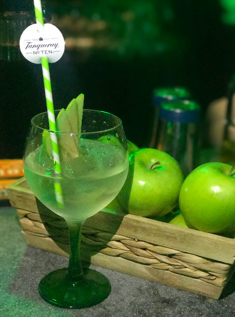 Amasu: Tanqueray Ten, amasu, 1 pizca de ácido cítrico, vino blanco Sauvignon Blanc, abanico de manzana verde.