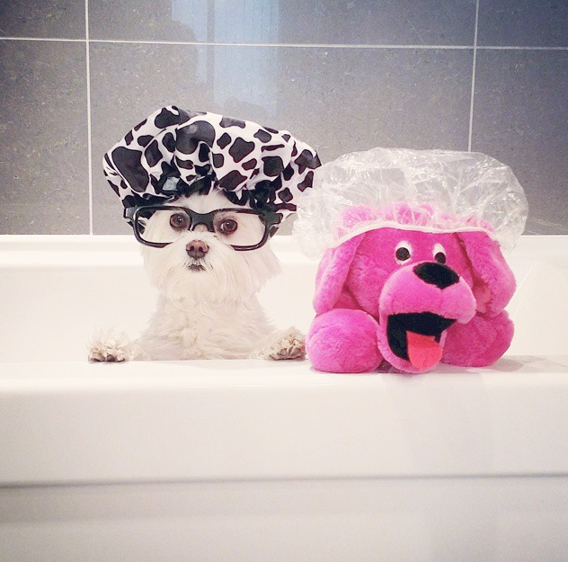 Al ser un perro hipster, las gafas y las camisas a cuadro siempre son parte de su look, inclusive en la bañera. Su actitud tan intelectual logra causar un efecto de ternura y sofisticación.