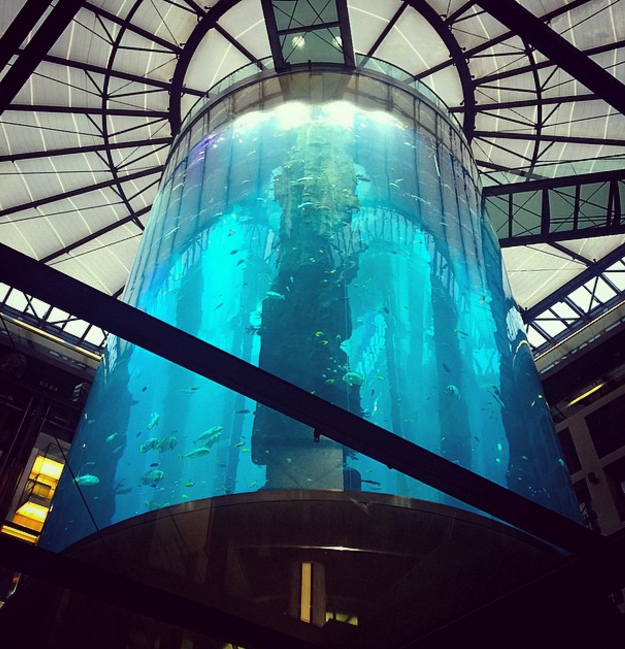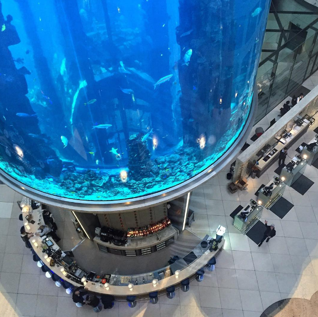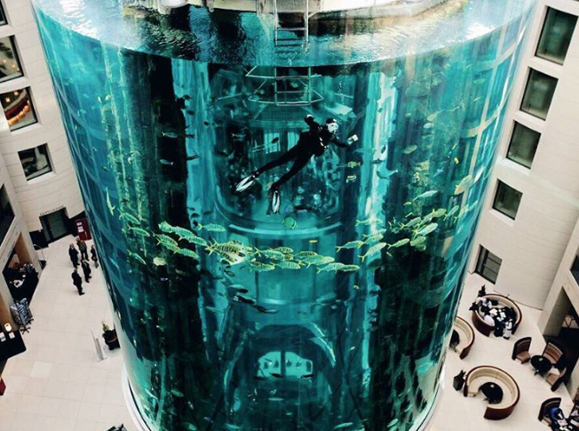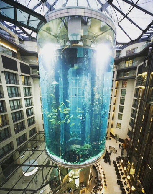 Se trata del AquDom, el acuario cilíndrico independiente más grande del mundo. Contiene un millón de litros de agua de mar y tiene varias especies animales y vegetales dentro del tanque.
