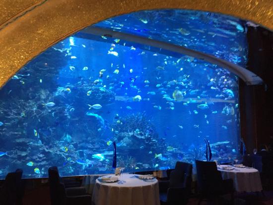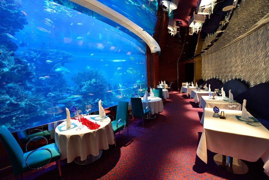 Se trata del Restaurante Al Mahara, situado en la planta baja del Burj Al Arab Hotel de Dubai, que además de impresionarte con su lujosa decoración, te dejará con la boca abierta con el enorme acuario de más de 5 metros de alto que se encuentra en el centro de las mesas, y que permite a sus clientes observar distintas especies marinas, entre las que se encuentra el famoso pez George.