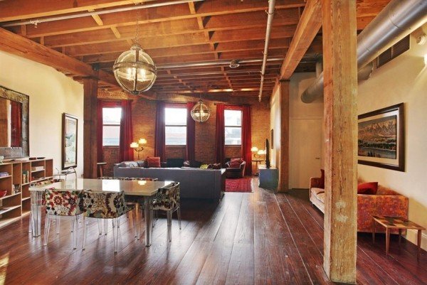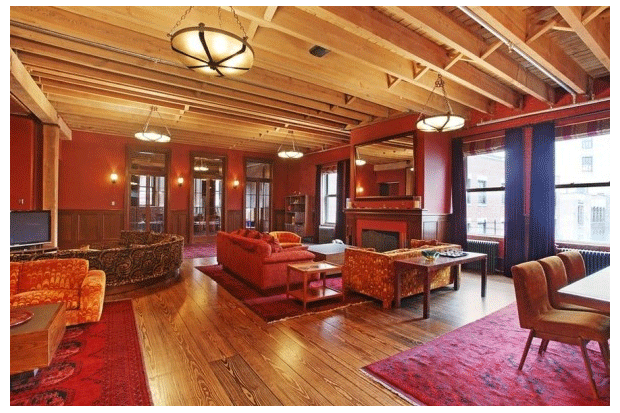 Por dentro tiene escaleras de madera y en el balcón de las escaleras de incendio, se encuentra un mini lounge. Por supuesto, en la sala se encuentra una chimenea enorme.