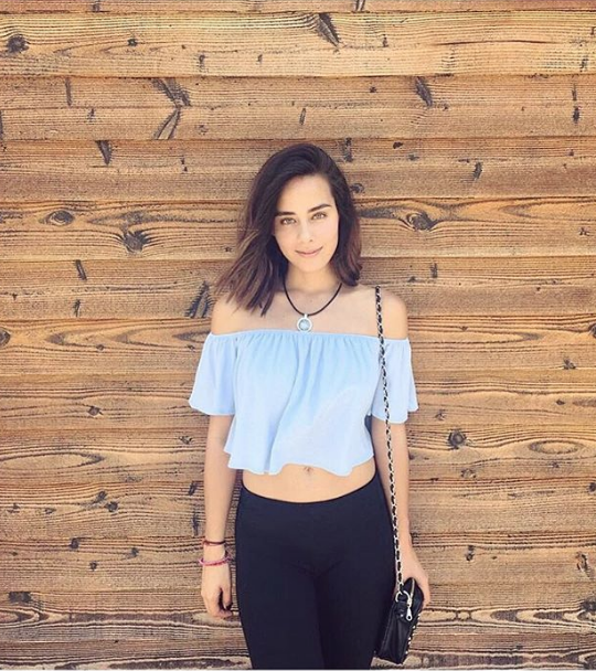 Esmeralda es fanática de usar blusas escotadas, descubiertas de los hombros o lisas de manga corta, las cuales complementa con leggins que resaltan su figura y diminuta cintura.