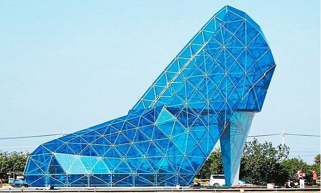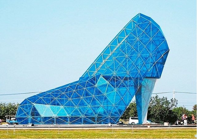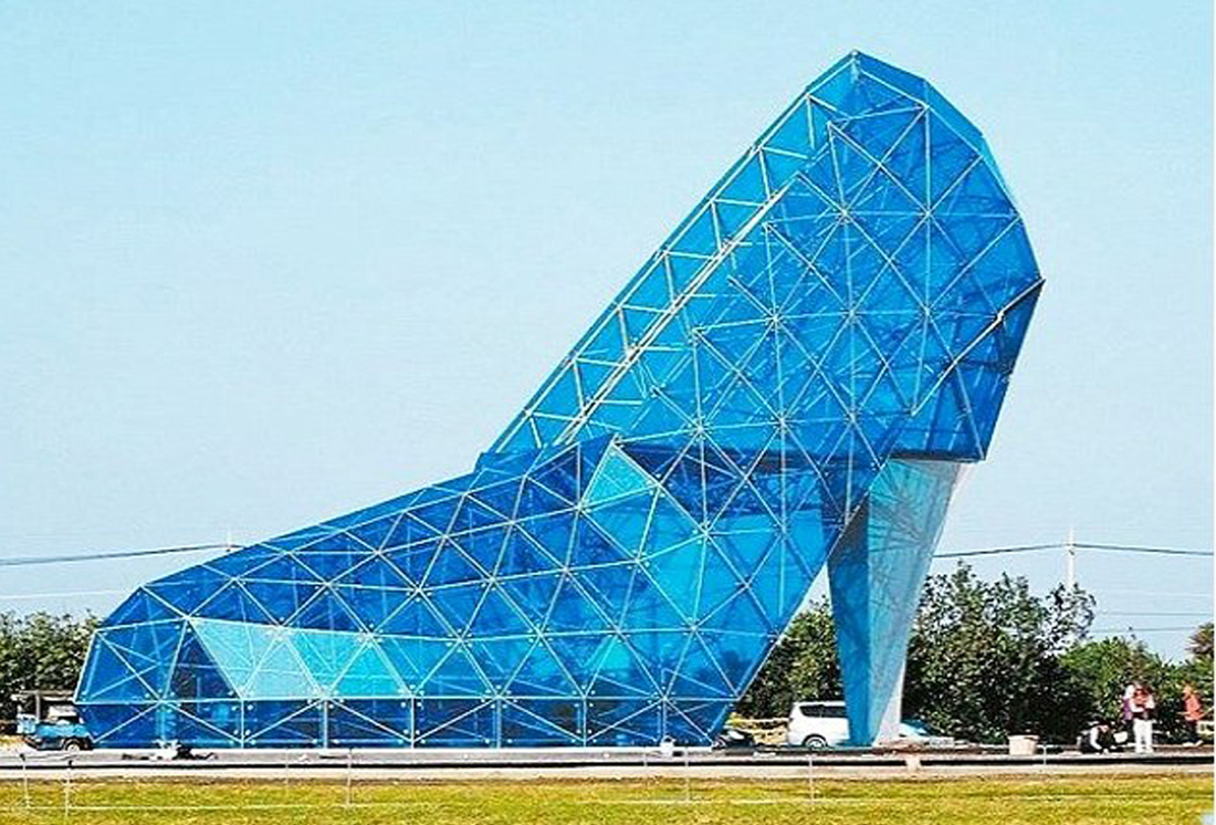 El hermoso zapato gigante tiene una altura de 17 metros por 10 de ancho, construido en vidrio y pintado en color azul.