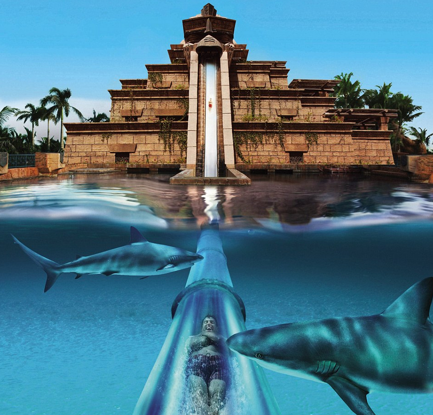 ¿Serías capaz de aventarte por un tobogán e ir directamente a un mundo lleno de tiburones? Pues si disfrutas llenarte de adrenalina, el tobogán Salto de fe en el hotel Atlantis, The Palm en Dubai, será toda una experiencia, pues jamás te olvidarás de la emocionante visión de tener tiburones a tus lados.