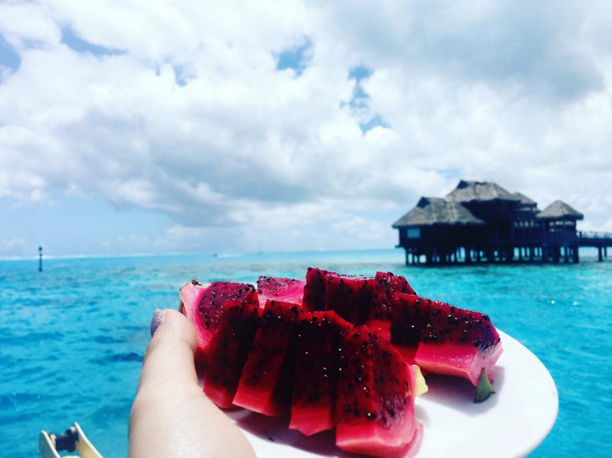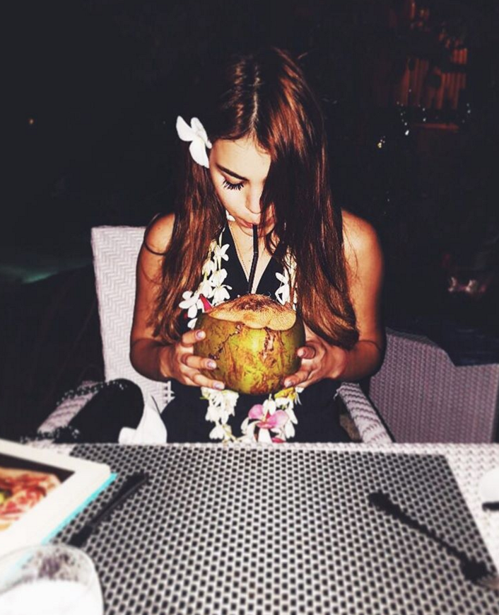 Danna Paola, también está aprovechando la oportunidad para conocer y gozar de la gastronomía del lugar, así lo deja ver en una fotografía que publicó en el que se aprecia un agradable fruto rojo, además una rica agua de coco la acompaña para refrescarse.