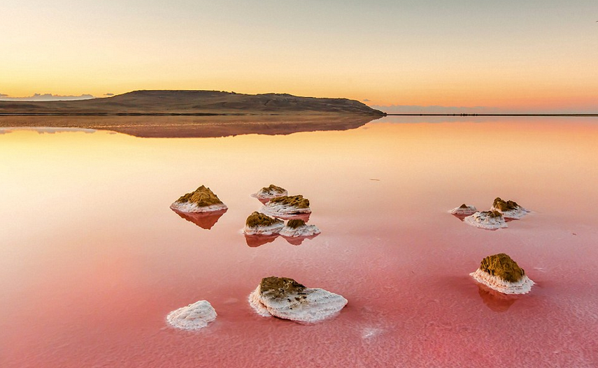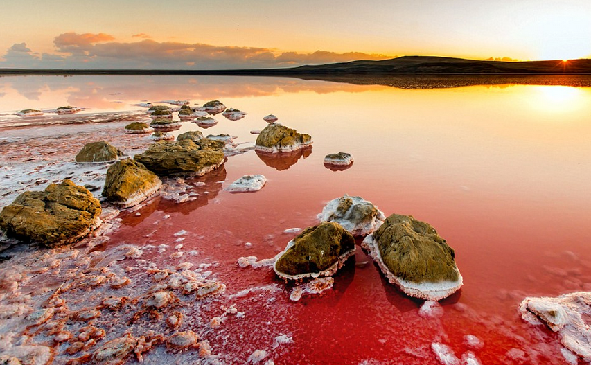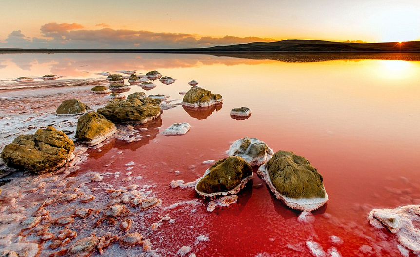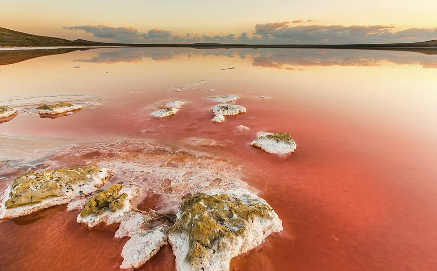 El impresionante paisaje que este lago llamado Koyashskoye, ubicado en la Península de Kerch en Crimea y regala tan magnífica tonalidad gracias a las múltiples algas que posee esta belleza.