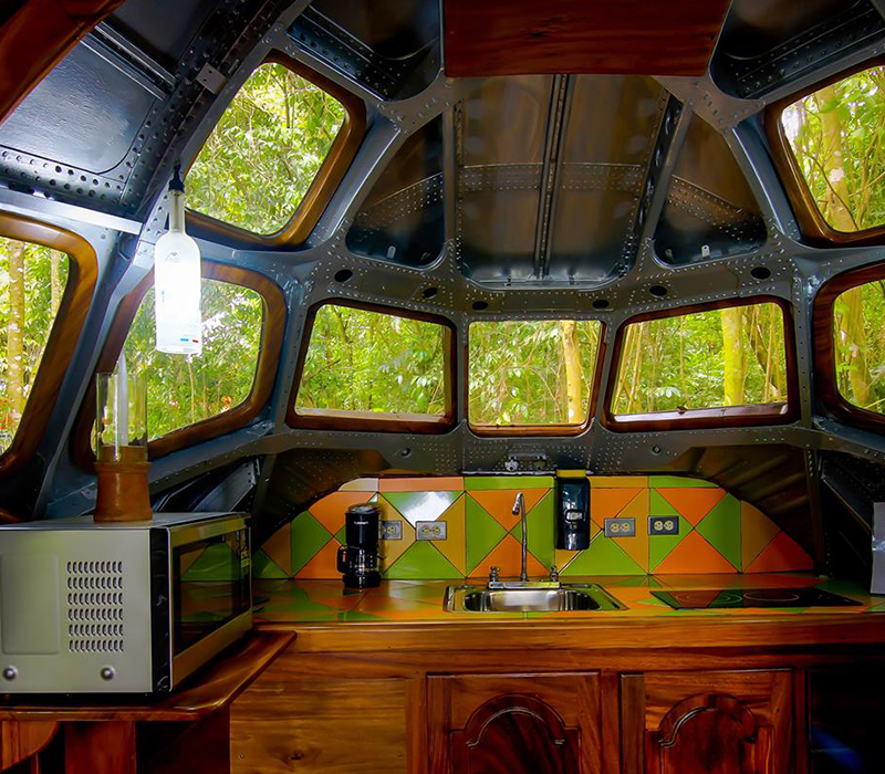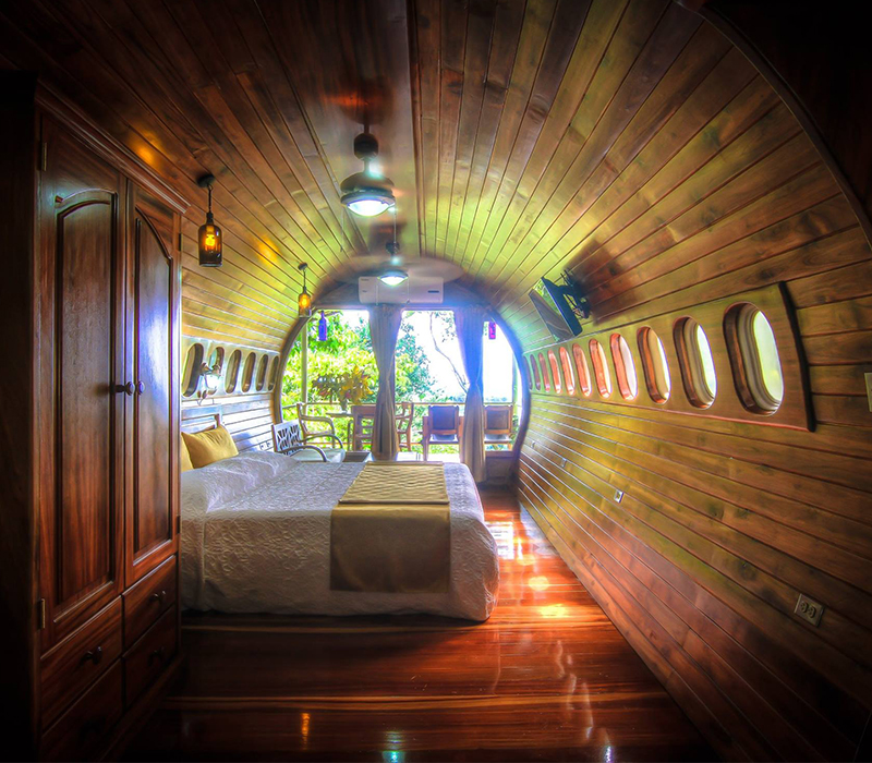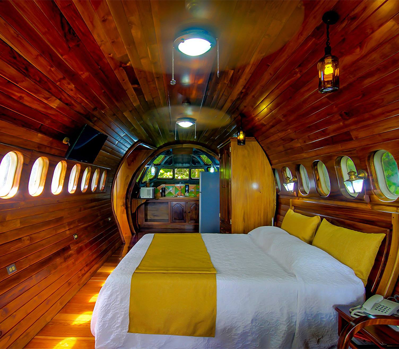 Se trata de las magnífica suite que es el principal atractivo del hotel Costa Verde. Dicho avión formó parte de la flota de South Africa Air y Avianca de Colombia. Hasta el último de sus días útiles quedó varado en el aeropuerto de San José, donde lo encontraron sus actuales dueños. Las cinco piezas principales se transportaron en enormes camiones hasta la selva de Manuel Antonio, donde ahora podrás pasar unas vacaciones sin iguales.