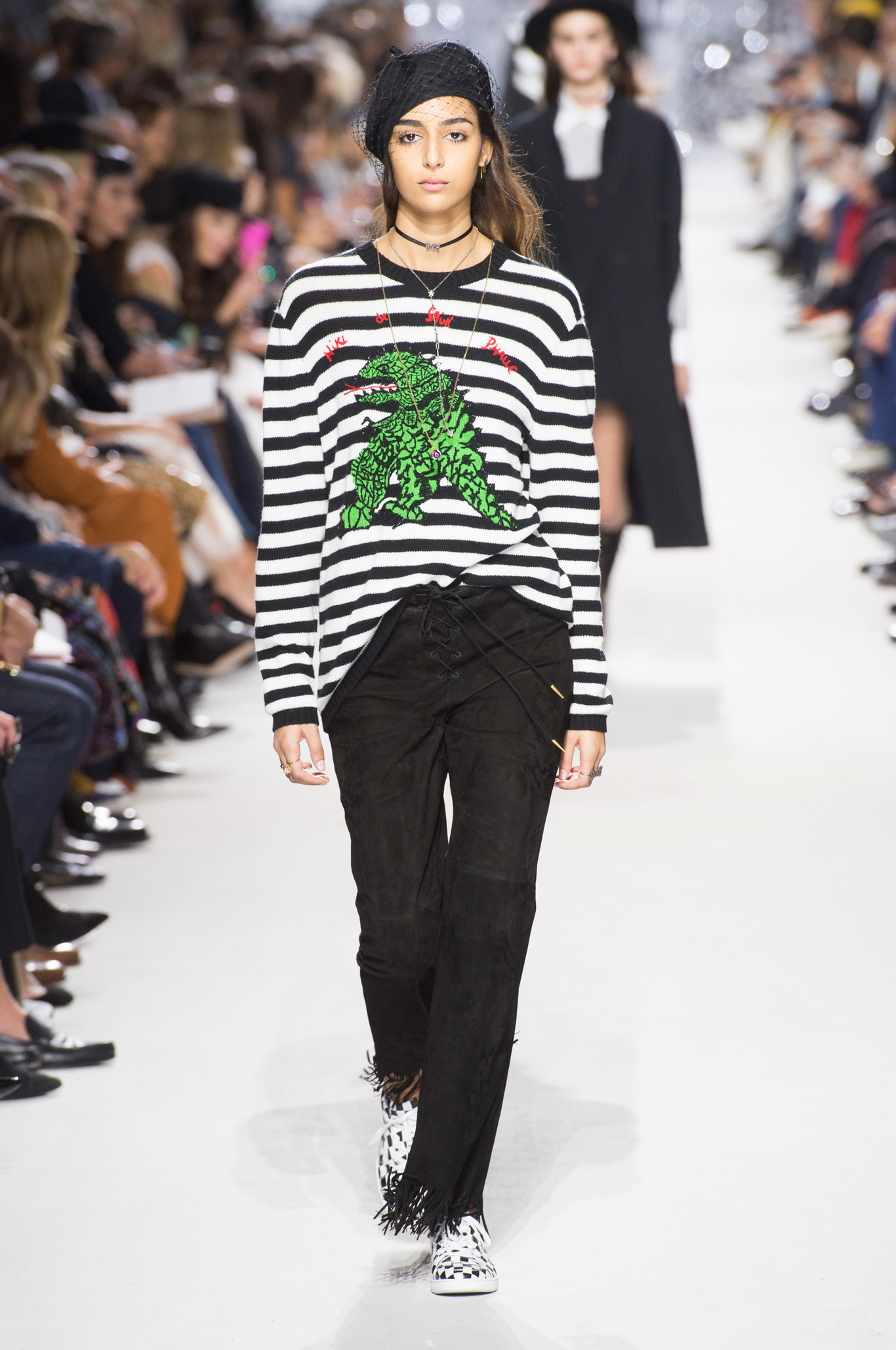 Todos recuerdan la emblemática playera de la firma que sentenciaba lo siguiente: “We should all be feminist”. Pues ahora, la modelo rusa Sasha Pivovarova encabezaba el desfile con una camiseta marinera en la que se podía leer: «Why have there been no great women artists?» (‘¿Por qué no ha habido grandes artistas mujeres?’).