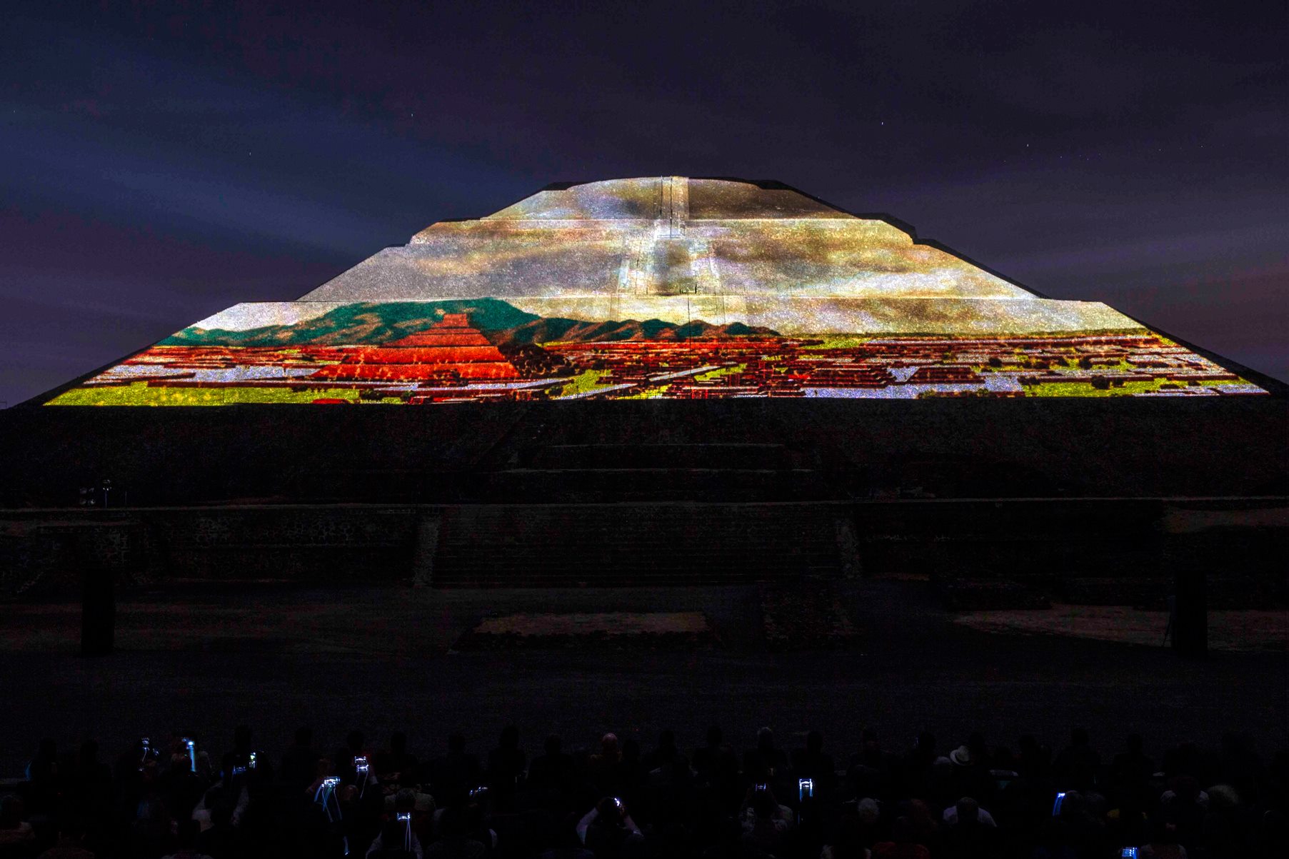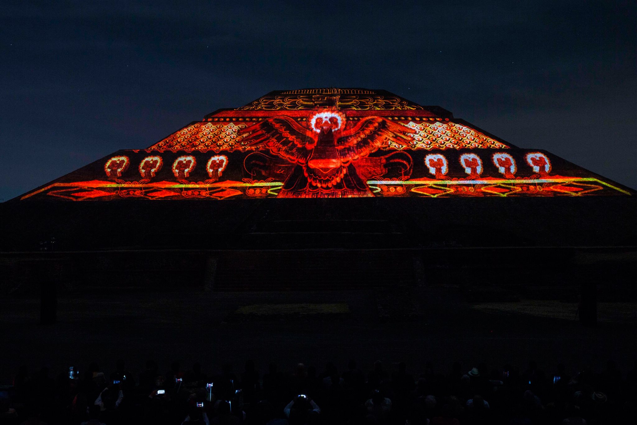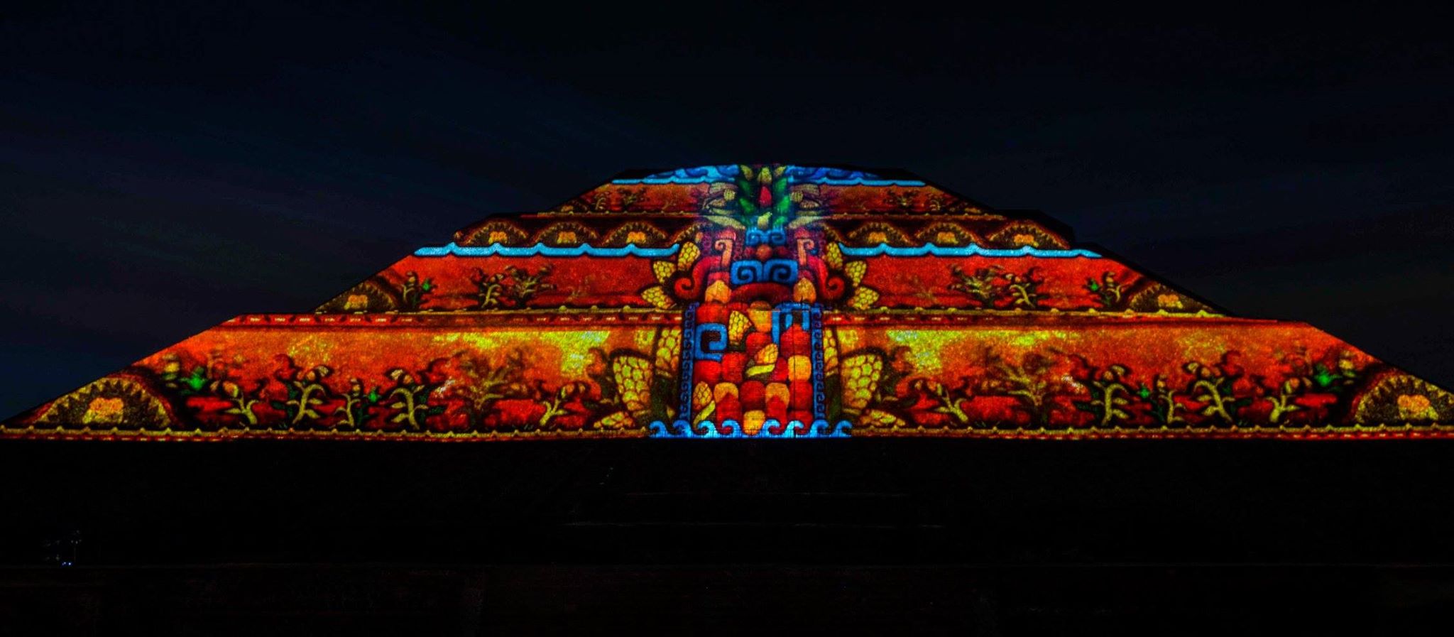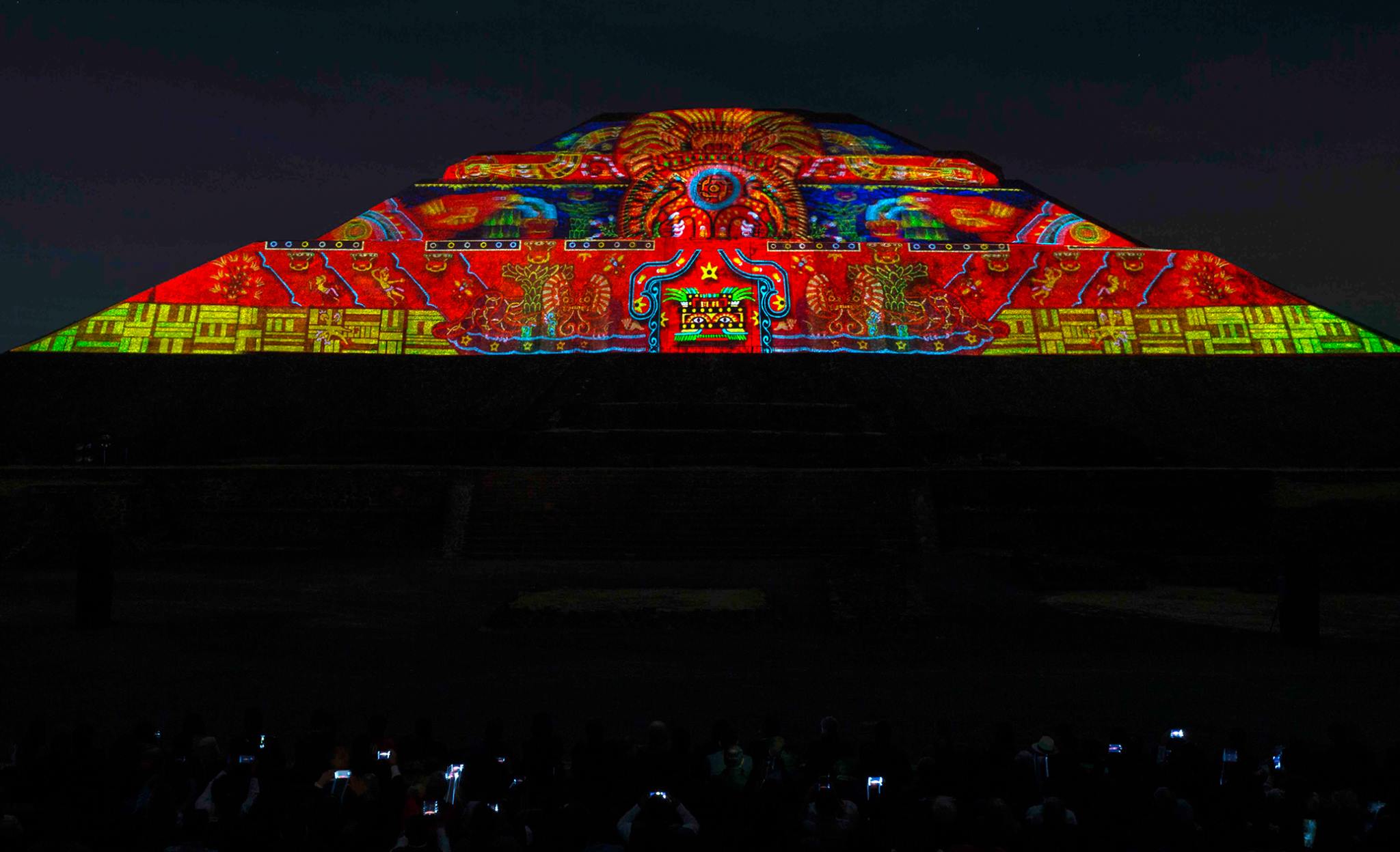 Esta experiencia de luz y sonido, consta de dos etapas, la primera se tiene la oportunidad de caminar por un tramo de la Calzada de los Muertos, en el que podrás apreciar la iluminación de la Pirámide del Sol y de la Luna, con los colores característicos de las ruinas arqueológicas, el recorrido tiene 10 estaciones a experimentar con un audioguía en español e inglés.