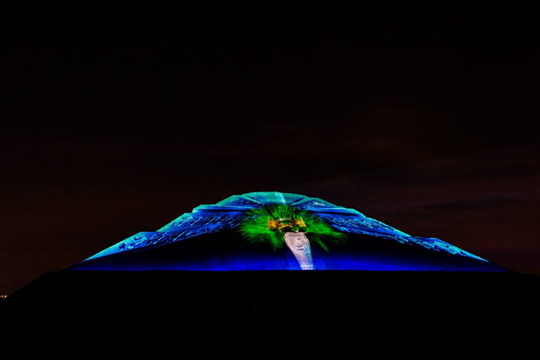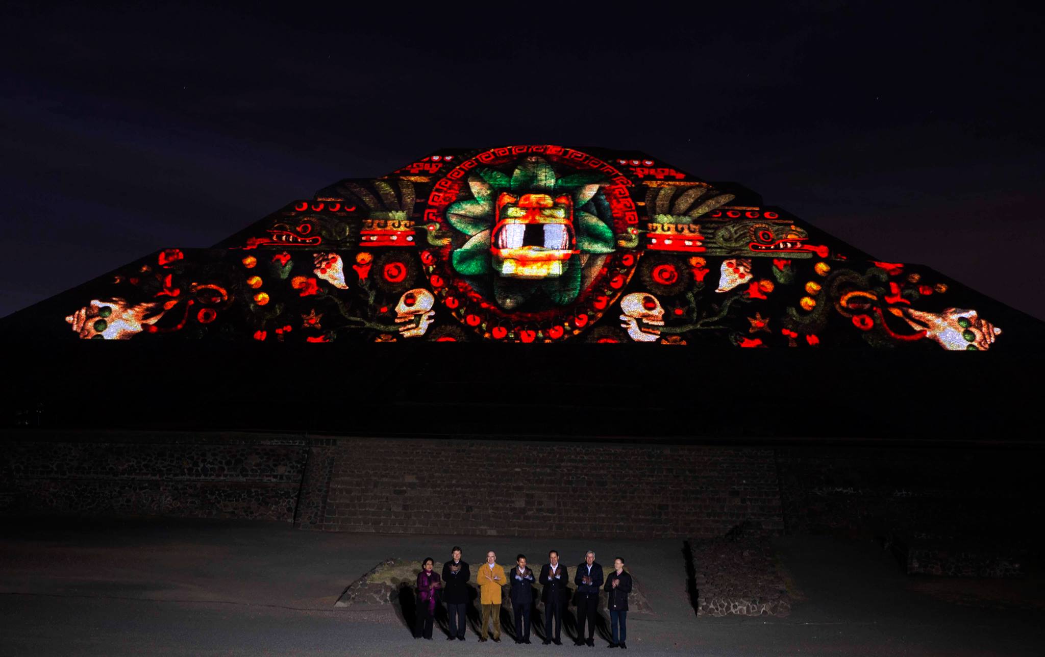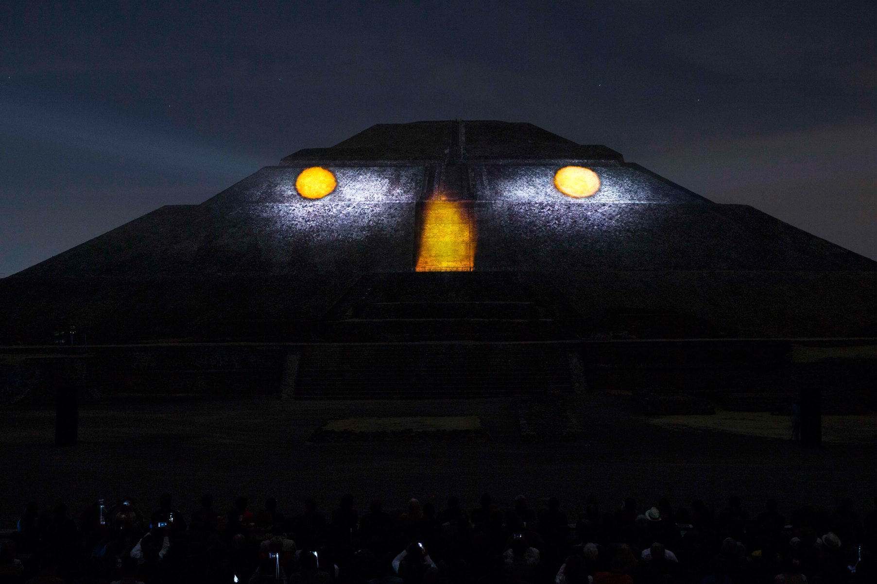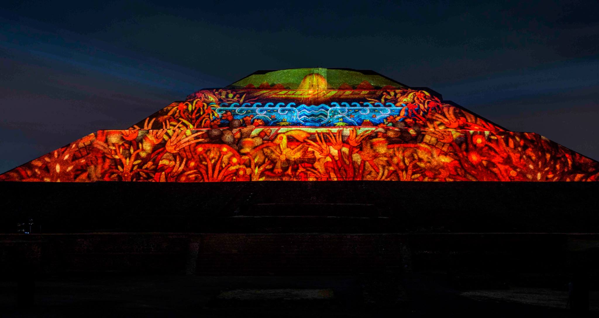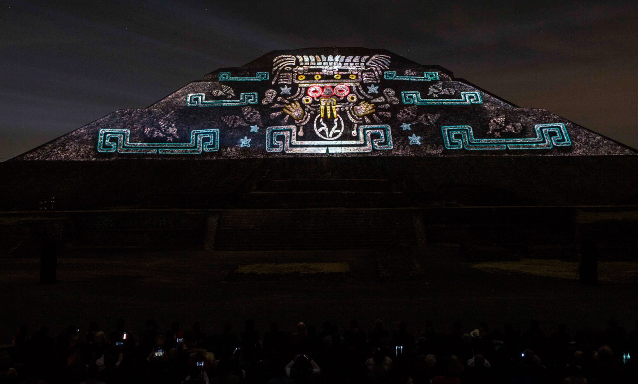Esta experiencia de luz y sonido, consta de dos etapas, la primera se tiene la oportunidad de caminar por un tramo de la Calzada de los Muertos, en el que podrás apreciar la iluminación de la Pirámide del Sol y de la Luna, con los colores característicos de las ruinas arqueológicas, el recorrido tiene 10 estaciones a experimentar con un audioguía en español e inglés.