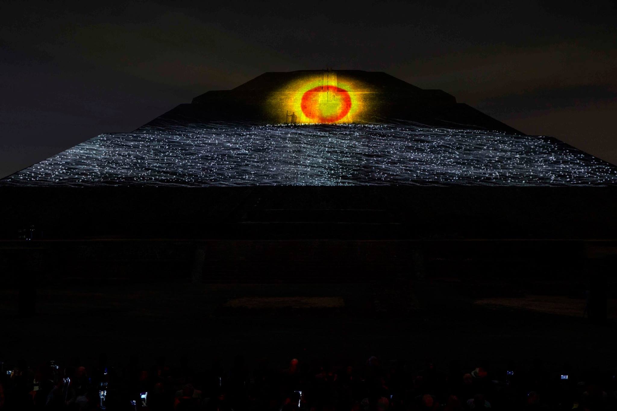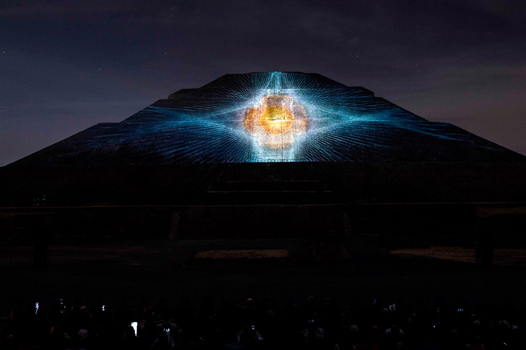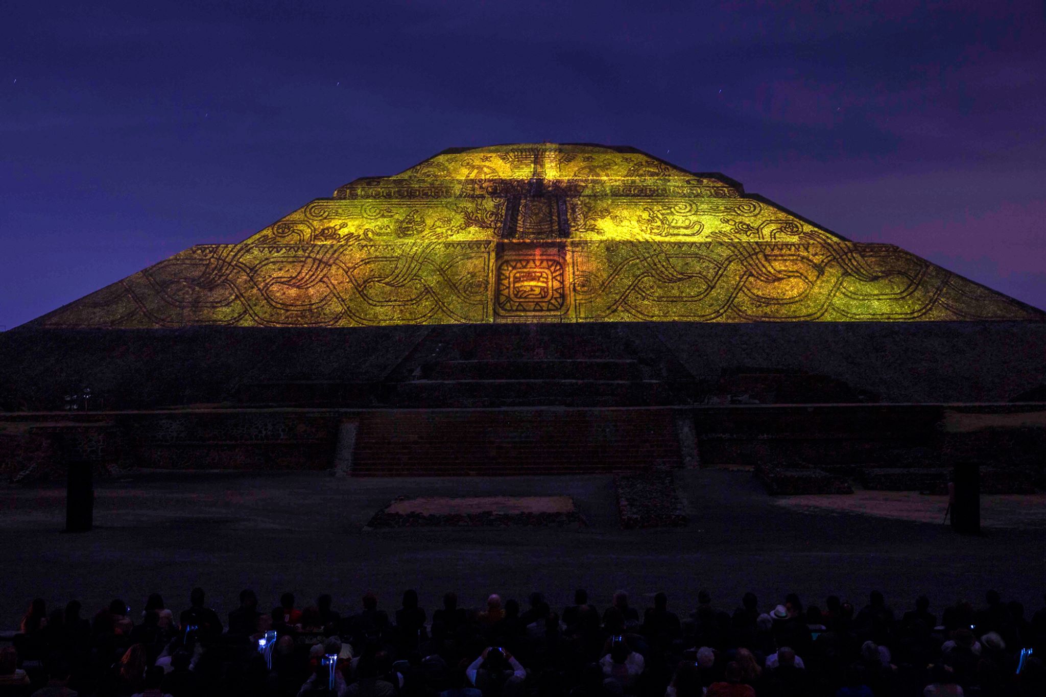 Después de la caminata por la Calzada de los Muertos, el audioguía le informará a los asistentes que deben dirigirse a la Pirámide del Sol, donde deberán tomar asiento frente a la cara poniente de dicha pirámide, para que de esta manera aprecien el espectáculo de luz y sonido que tiene una duración de 32 minutos.