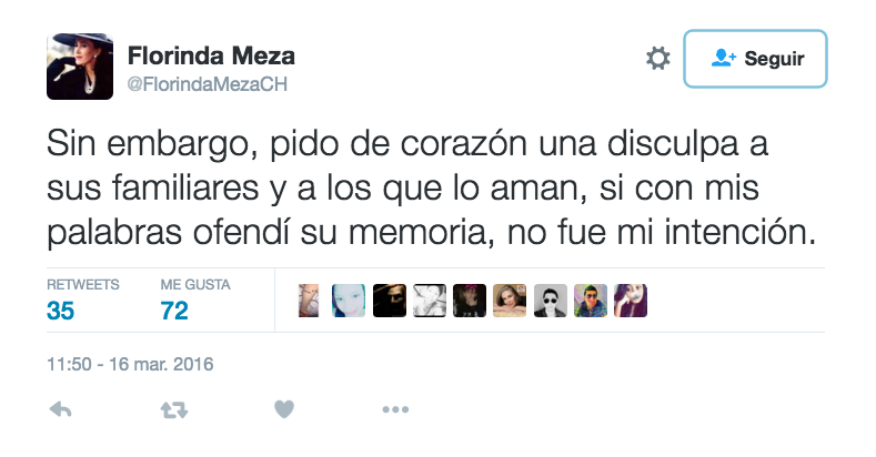 “Pido de corazón una disculpa a sus familiares y a los que lo aman, si con mis palabras ofendí su memoria no fue mi intención” (sic).