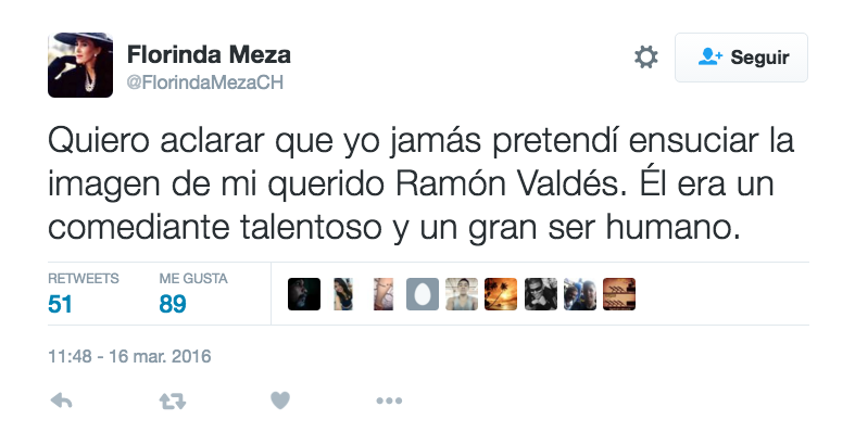 Tras sus declaraciones, la viuda de Roberto Gómez Bolaños ‘Chespirito’, recurrió a su cuenta de Twitter para disculparse con la familia de Ramón Valdés.
