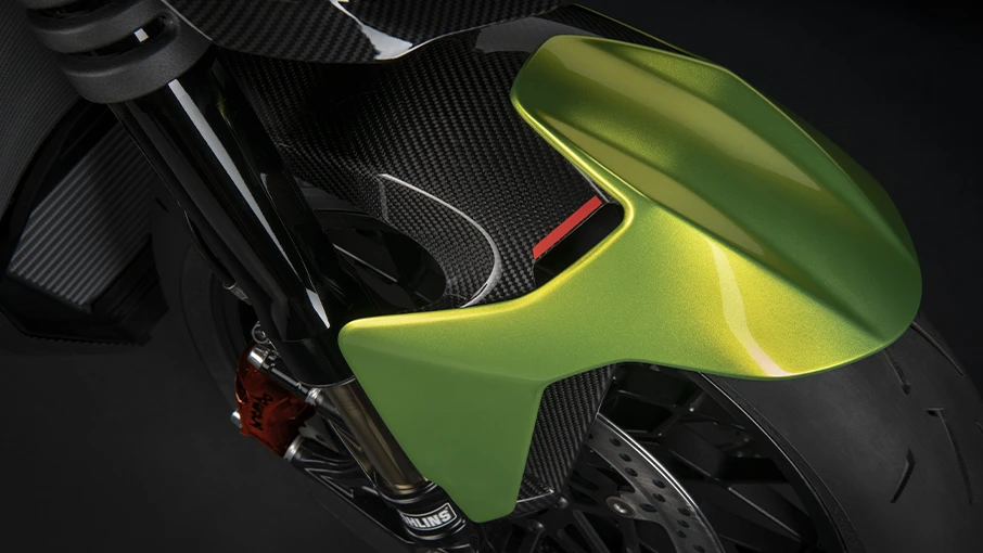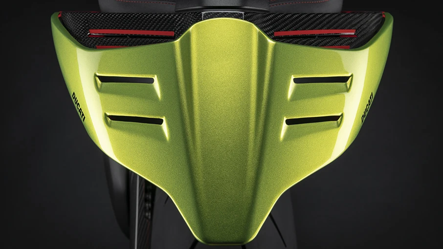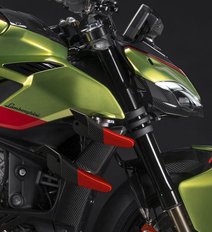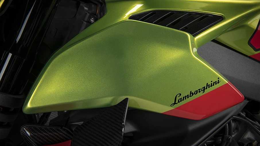 El carenado cuenta con ventilaciones al estilo Lamborghini, todas en fibra de carbono, desde la salpicadura delantera, los costados y la parte trasera.