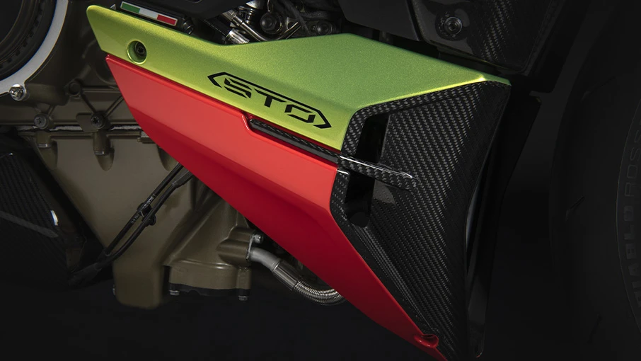 En el costado derecho se hace notar un escape con silenciador Akrapovič de titanio con una tapa en fibra de carbono; las tomas de aire laterales tienen la tipografía del STO.