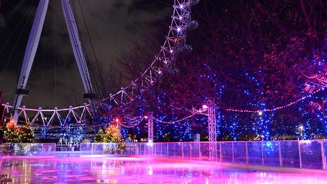 En este lugar no encontrarás más que un espíritu totalmente navideño, además de una iluminación de colores fríos como azul, morada y hasta violetas que se combinan con las luces del London Eye, los edificios de alrededor y la pista de hielo.