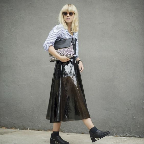 Ya sean midi o mini, las faldas de tipo látex, aparte de mantenerte calientita, le darán un toque sexy a tu outfit de diario. Úsalas en tonos diferentes al negro (cómo rosa o rojo) y lucirás súper trendy.