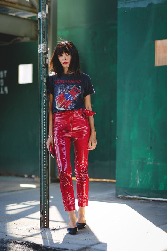 Y en otra prenda donde el látex te hará lucir increíble es precisamente en los pantalones, ya sea en tipo cigarettes o en coulottes, este material le dará un toque chic y diferente a todo tu outfit. Combínalos con crop tops o suéteres XL y te verás súper trendy.