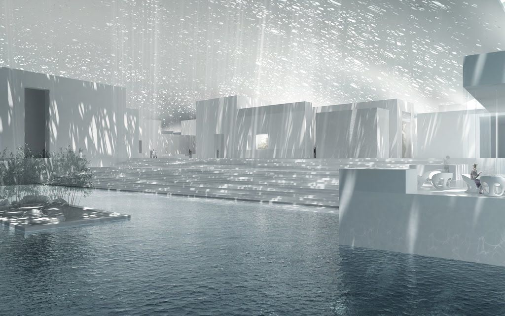 La construcción esta sumamente rara, pues está situada temporalmente sobre el mar. Su maravillosa arquitectura está inspirada en el estilo árabe, pues tiene una cúpula doble y plana. La forma está llena de estilo, pues su geometría es luminosa y tiene un tejido perforado que logra crear una impresionante sombra.