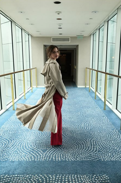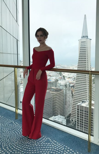 Emma decidió complementar el outfit con zapatos de Manolo Blahnik, así como mini arracadas y un anillo de oro fabricados a mano de la firma All Blues. Fue así como brilló durante la promoción de su nueva cinta The Circle.