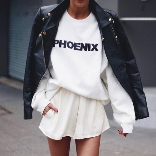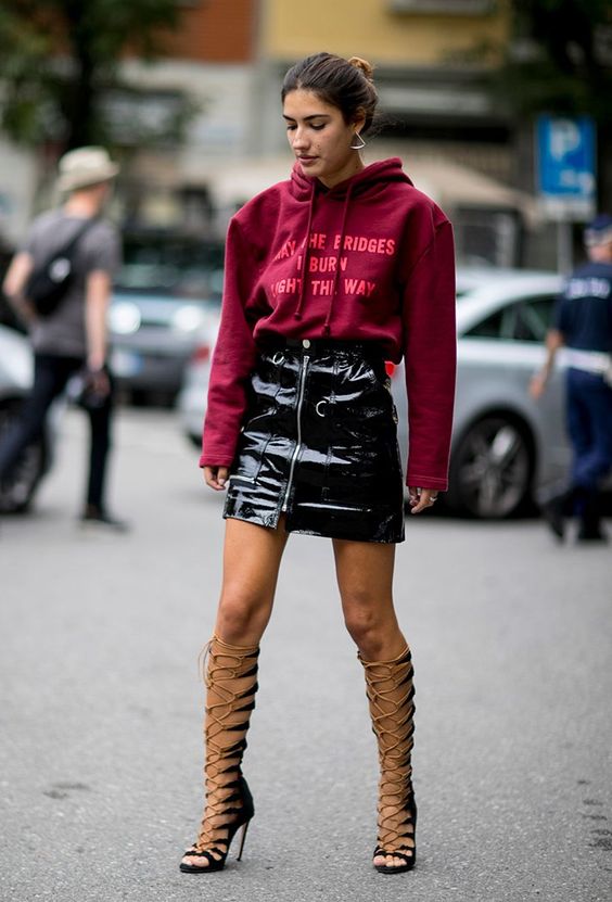 Otra apuesta ganadora a la hora de combinar con las sudaderas es el cuero o la polipiel (de la cual somos cada día más fans). Elige la prenda que prefieras, porque ya sea una minifalda, un short o un pantalón, este tejido consigue una armonía perfecta con las sudaderas para, incluso, salir de noche.