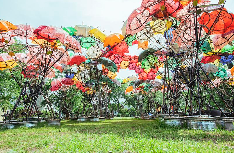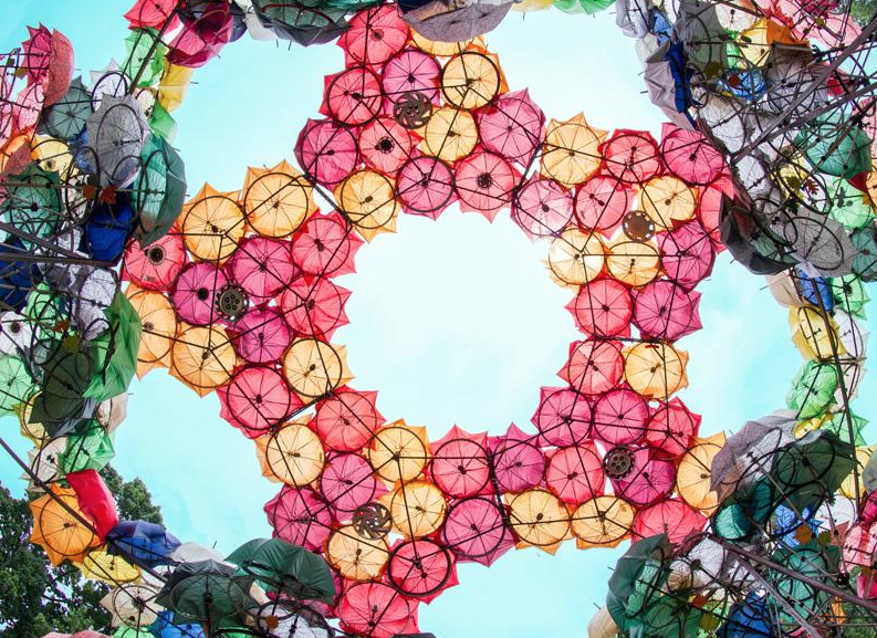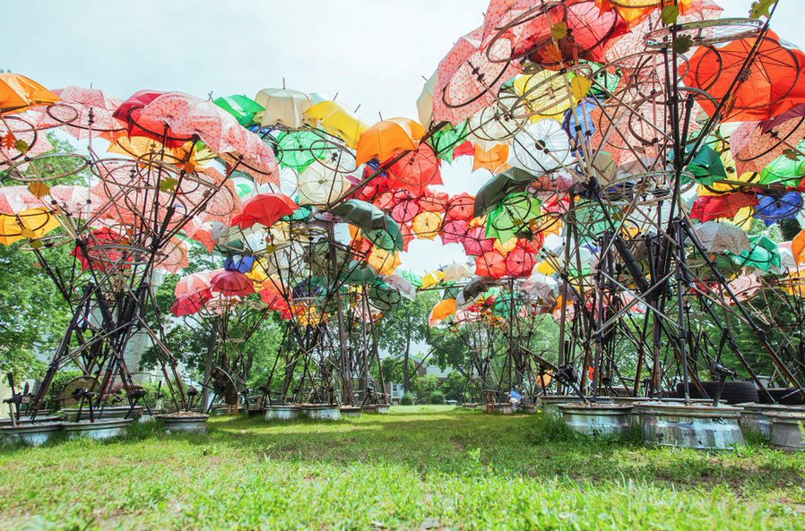 La construcción fue hecha con materiales 100% reciclados entre los que se encuentran: paraguas, llantas, bicicletas en partes, entre otras cosas más.