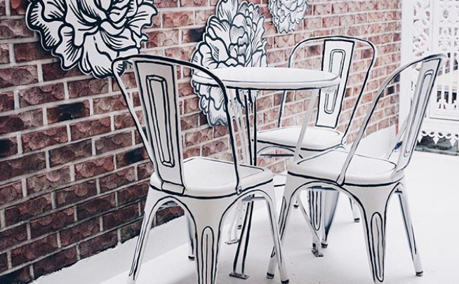 La inspiración para que las sillas, tazas, paredes y decoración estuviera en blanco y negro, se debió a una exitosa comedia coreana titulada W, en la que dos personajes transitan en dos universos, el mundo real y un mundo animado.
