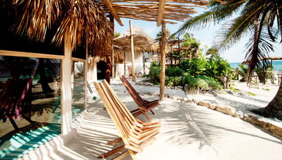 Las cabañas y casitas del complejo se extienden a lo largo de la playa de 800 metros de la propiedad, todas cerca del mar. Una saliente rocosa natural frente al mar, mantiene a las cabañas lejos del nivel de la arena resultando en vistas espectaculares de las aguas turquesa del Mar Caribe.