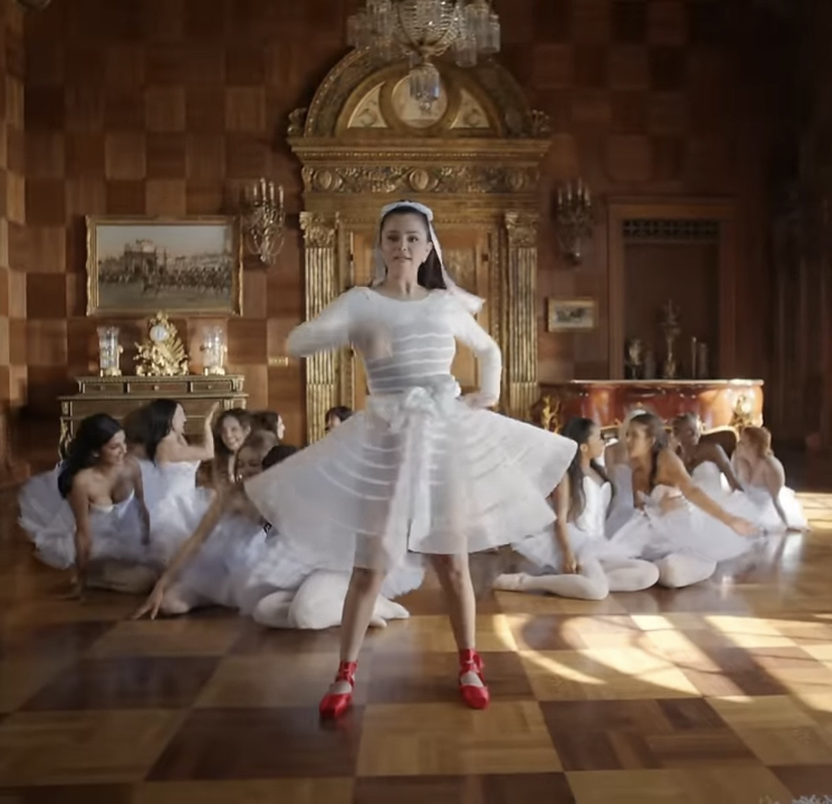 Selena Gomez es “the ultimate Oscar girl” y así lo confirma con los outfits que usó para el videoclip de su nueva canción, “Love On”. La producción inicia con múltiples parejas besándose, mientras la cámara va subiendo las escaleras hasta encontrar a Selena, quien carga un perro y porta un vestido rosa mexicano con un bow negro en el cabello.