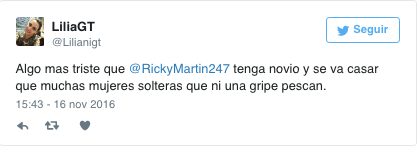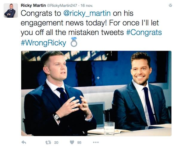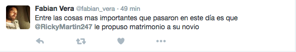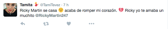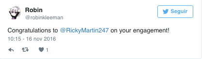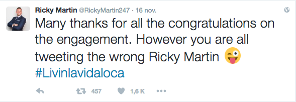 Ante la confusión, el empresario decidió sacar de su error a los usuarios, a quienes escribió un par de mensajes en los que se leen: «Muchas gracias a todos por las felicitaciones por el compromiso. Sin embargo, todos ustedes están tuiteando al Ricky Martin equivocado«, así como «Felicidades a @ricky_martin por la noticia de su compromiso. Pero una vez más los tuits están equivocados«, escribió en su cuenta personal.