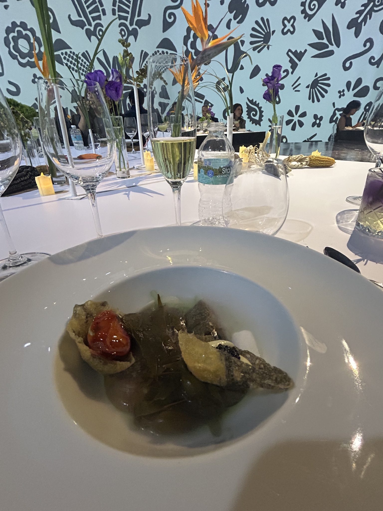 El gazpacho de aguacate con caviar de algas refrescó el paladar con su textura sedosa y su guiño al mar. El falso ostión —una reinvención elegante con mejillones, puré de berenjena y glaseado de guajillo— sorprendió tanto por su sabor como por su presentación. El buñuelo de papa con poro y caviar cerró esta primera parte con un balance perfecto entre lo terrenal y lo marino.