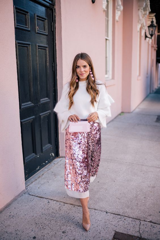 En primer lugar es importante que elijas una sola pieza que tenga lentejuelas, una blusa, una falda, un pantalón, una chamarra, suéter o un vestido. Ojo, es importante que sólo sea una pieza para que no satures el look y ésta se convierta en el foco de atención del outfit.