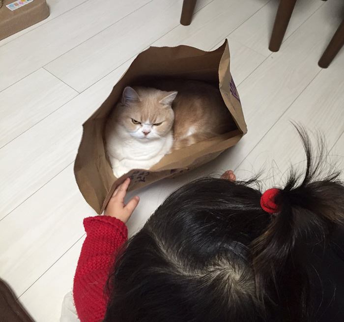 A pesar de tener una cara de enojada, decepcionada y que odia la vida tanto como a la humanidad, es una gatita súper tierna, es sólo que nació con el ceño un poco más grande y por ende, se frunce todo el tiempo sin que esté molesta.