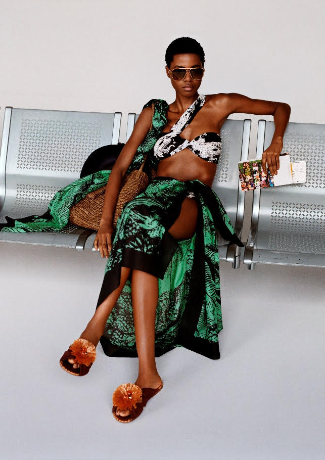 Conformada por 25 piezas, la colección captura la esencia de un estilo vacacional aspiracional con un aire cinematográfico. Colores vibrantes, estampados llamativos y siluetas de alto impacto se combinan en diseños versátiles, ideales tanto para un día de relajación junto a la piscina como para una noche inolvidable. Las prendas incluyen telas suaves y translúcidas adornadas con olanes flotantes, evocando la brisa veraniega, así como tejidos florales y prints con motivos de loto y elefantes, rindiendo homenaje al lujo exótico característico de la serie.