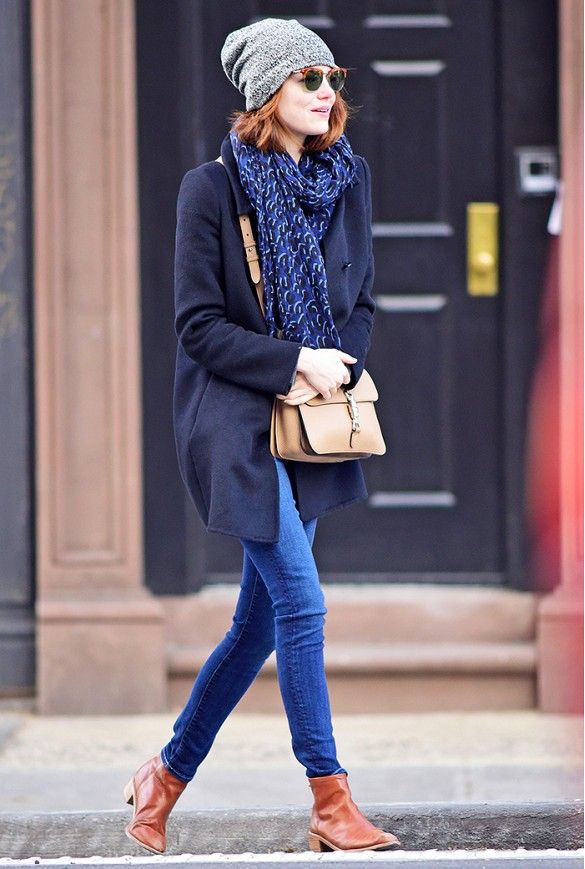 Accesorios: Las gafas de sol son un favorito para la actriz. Al mismo tiempo, los sombreros y beanis son un must en su clóset, incluso los usa bajo el sol y sobre todo, la bolsa cartera: lisa y de colores fuertes como el vino.