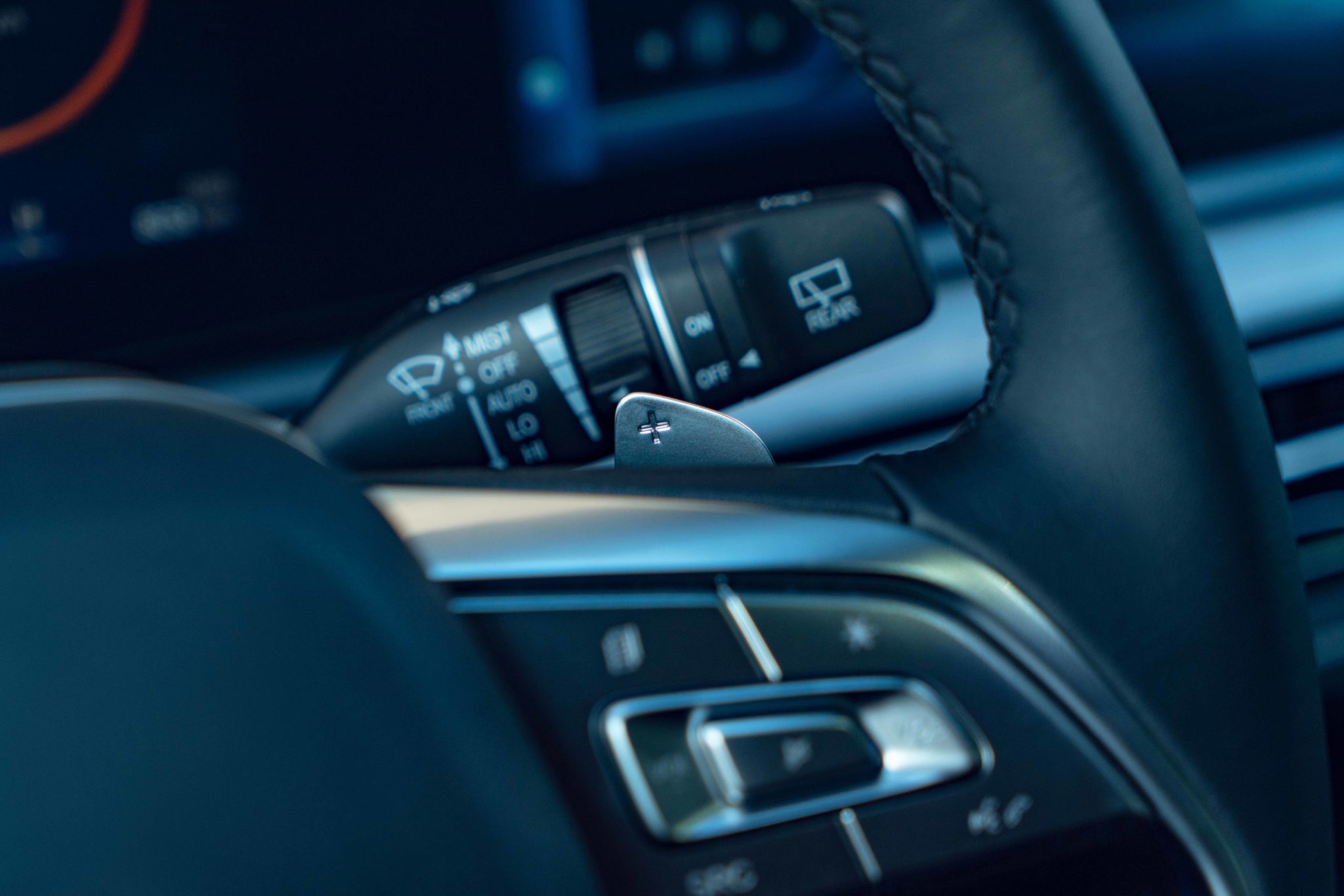 Debajo de las ventilaciones centrales se encuentra una pantalla sensible al tacto, desde donde se controla el aire acondicionado. Detrás de ésta hay un cargador inalámbrico para iphones. Otro punto que la hace notar más moderna es que no tiene una palanca de velocidades, sino una perilla en tono negro piano con el botón de parking al centro. Quizá lo que le hace falta es un modo de manejo ECO; incluso me atrevo a decir que también podría ofrecer un modo SPORT.