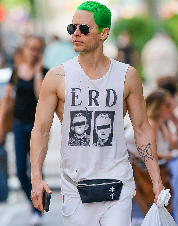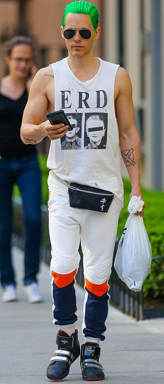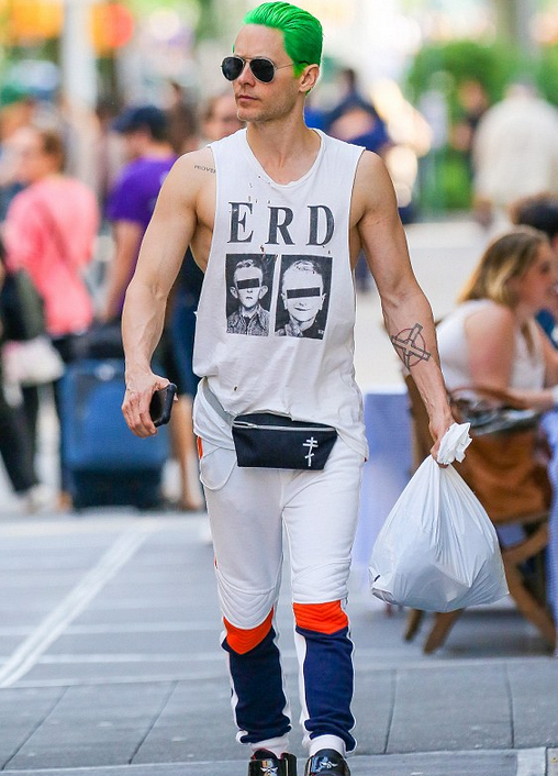 Con el cabello verde, el actor que de 43 años, salió a las calles de Nueva York con un look muy sporty, utilizando una playera sin mangas de uno de sus diseñadores favoritos Enfants Riches Déprimés. Maravilladas las calles de NY, pues se pudieron deleitar con los increíbles bíceps de este guapo actor. El Club de Compradores de Dallas también fue protagonista en la vestimenta sport del nuevo Joker, pues utilizaba un pants blanco con franjas naranjas y azules debajo de las rodillas. Como complemento de su outfit, utilizó una fanny pack negra. Sin duda Jared se encontraba de lo más cómodo.